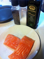 Invest in good olive oil if you haven't already. It will change your life. You may have to find an Italian market to really get some good stuff. Either way, use the best olive oil you have on hand and brush some onto both sides of the salmon, then simply grind some salt and pepper onto both sides. Or you can season with a fish herb blend or dill or whatever you please. But really, a good salmon will be fine with just salt, pepper and olive oil.